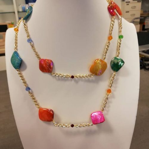Collana lunga con madreperla multicolor a forma di rombo e cristalli bicono multicolor. Catena dorata. Lunghezza: 94 cm.