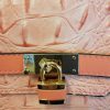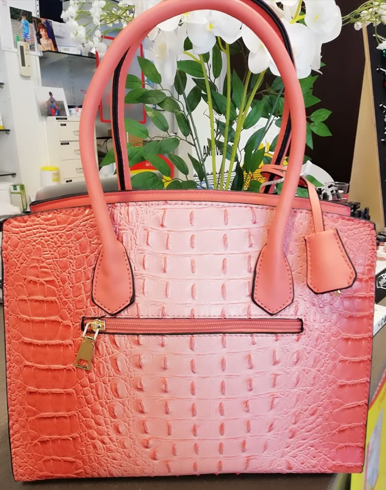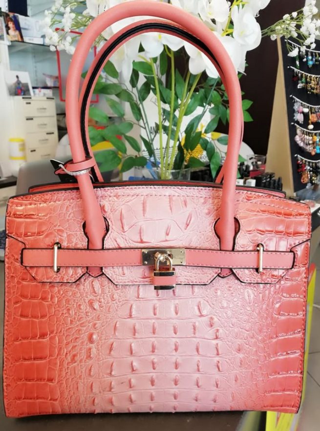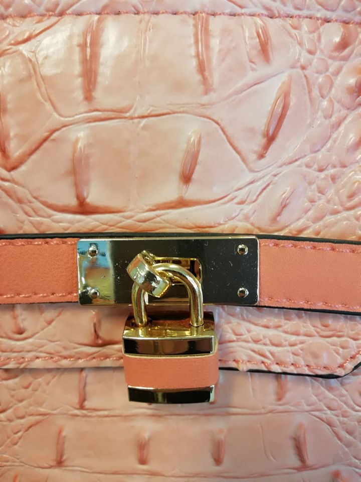 Borsa rosa antico stile Hermès imitazione coccodrillo con chiusura a cerniera. Due manici con possibilità di prolunga. Quattro tasche interne di cui due con chiusura a cerniera. Misure: lunghezza 31 cm circa, altezza cm 26 circa, profondità alla base cm 14.