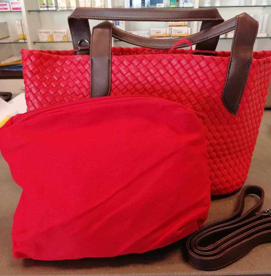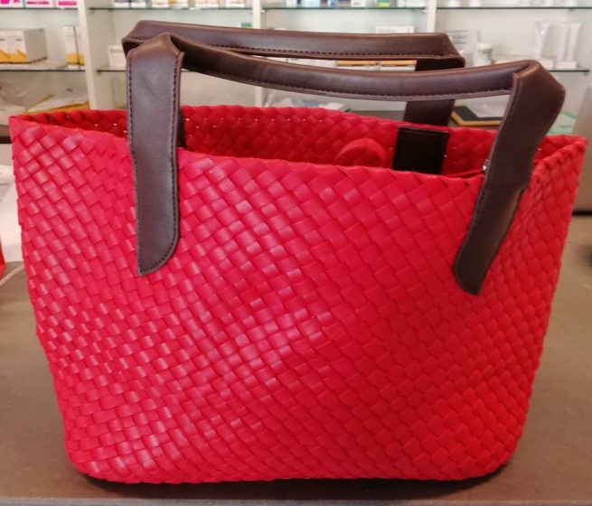 Linea primavera-estate 2019. Borsa rossa intrecciata in ecopelle con doppio manico marrone e manico allungabile. All’interno, busta in tela rossa con chiusura a cerniera.