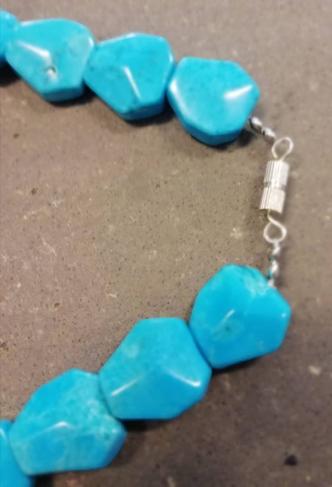 Bracciale elasticizzato con turchesi stabilizzati esagonali, turchesi Three Flowers, perle coltivate naturali pepita bianche.