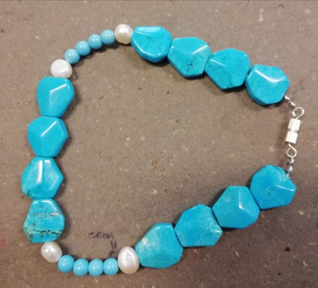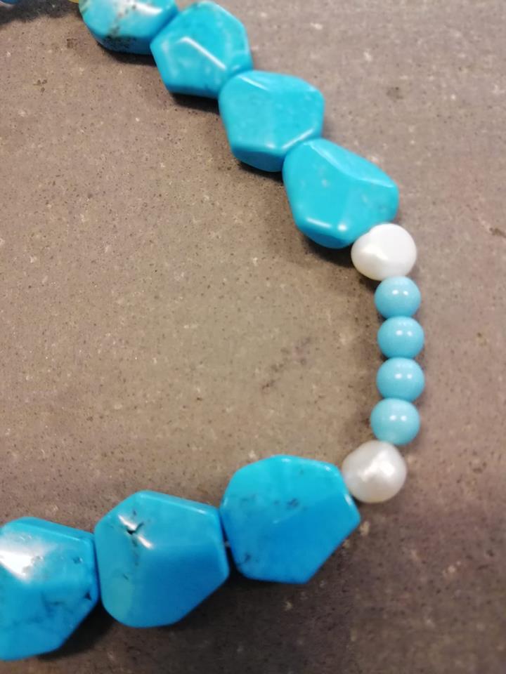 Bracciali con turchesi stabilizzati esagonali (12 x 12 x 5mm), turchesi Three Flowers (4 mm), perle coltivate naturali pepita bianche (6 mm).