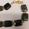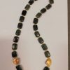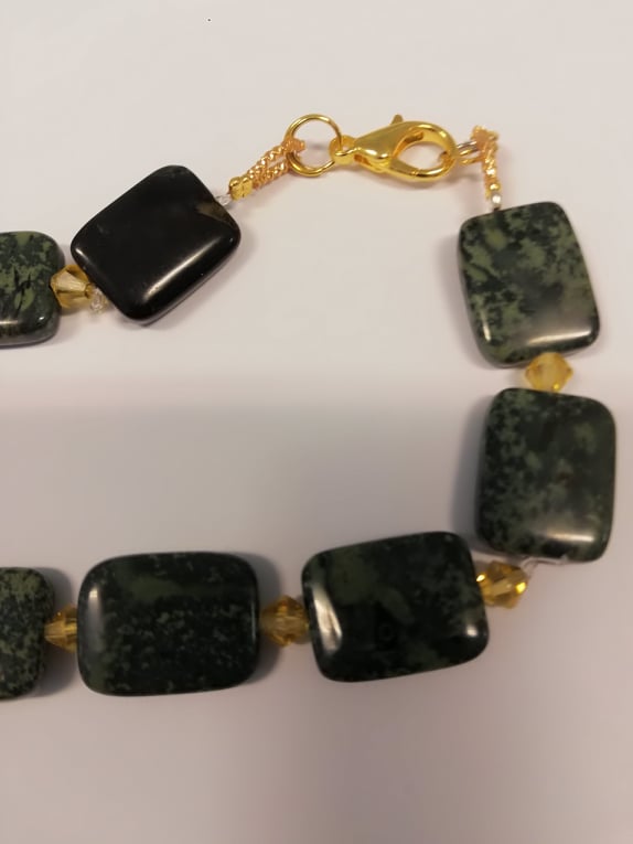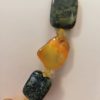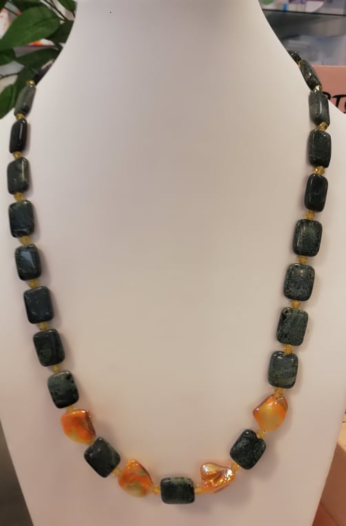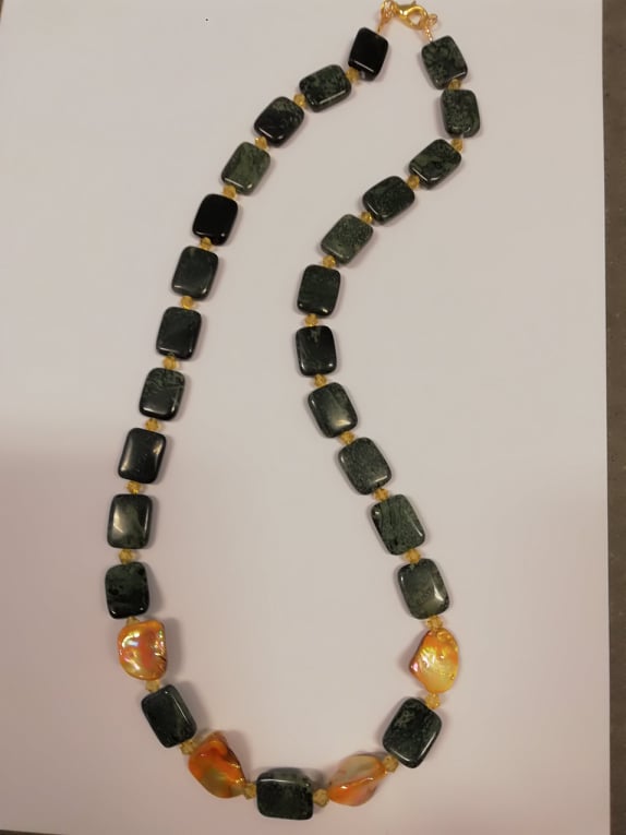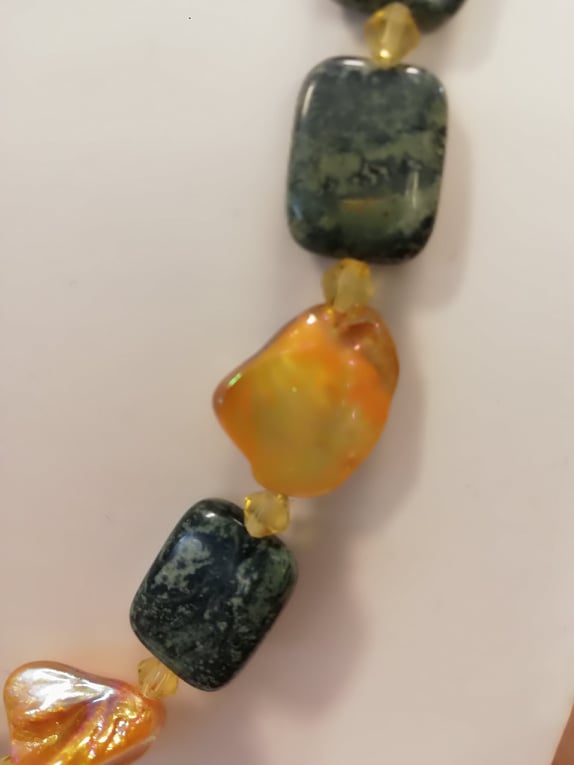 Collana con pietre di diaspro verde (cm 2 x 1), cristalli bicono giallo-arancio (mm 4), perle di madreperla arancione di forma irregolare. Moschettone gold plated. Lunghezza 61 cm.