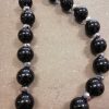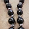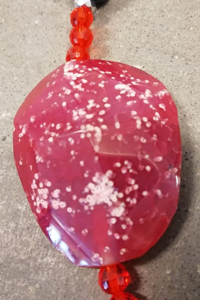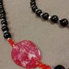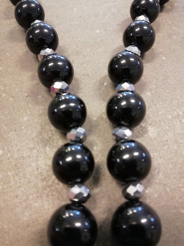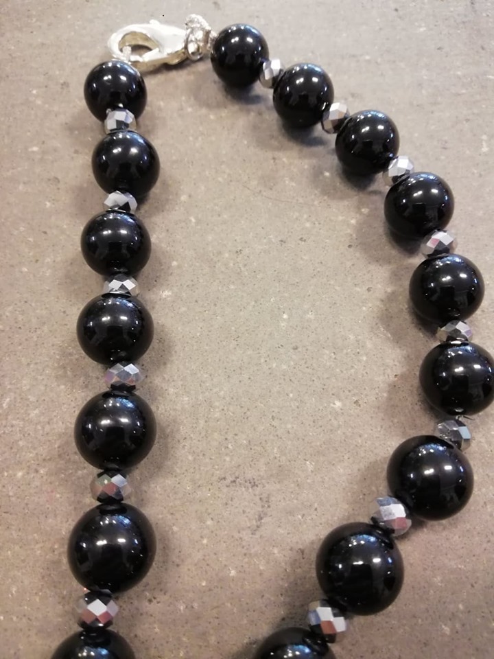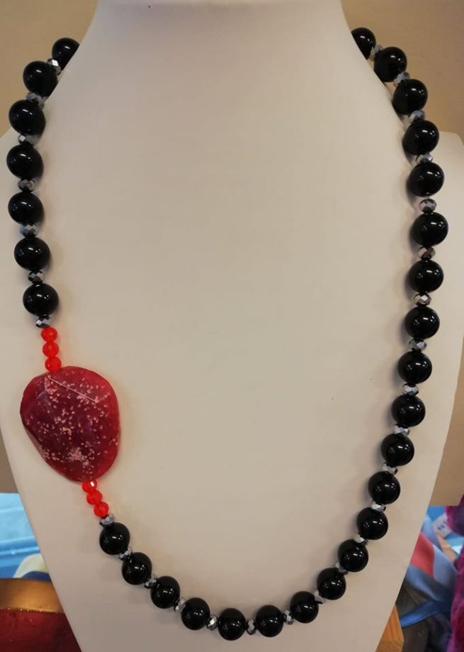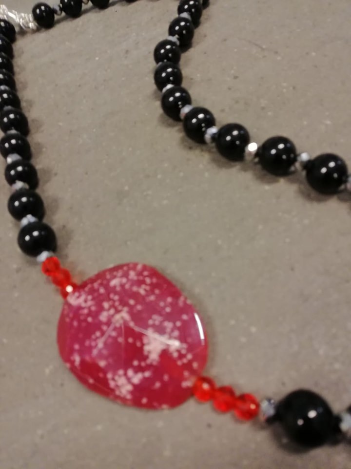 Collana di perle di onice nero tondo liscio (12 mm), cristalli argento (6 mm), cristalli tondi rossi (6 mm), agata rossa. Lunghezza 65 cm.