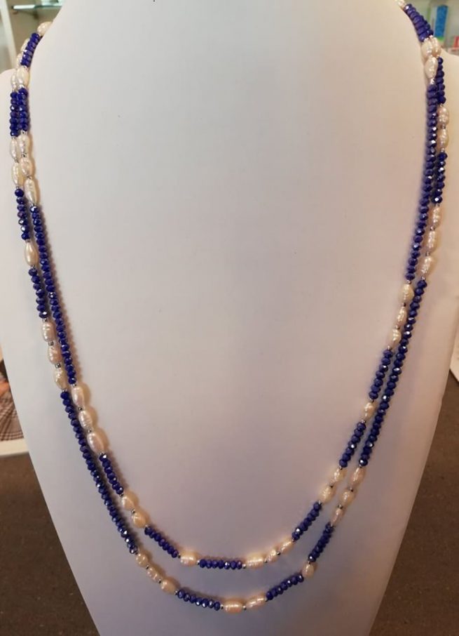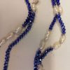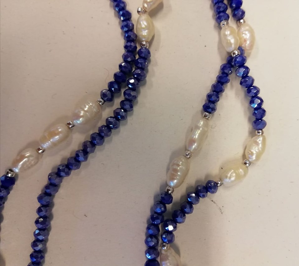 Collana con perline di fiume naturali e cristalli blu (2 mm). Lunghezza 69 cm. Può essere indossata lunga o a due giri.