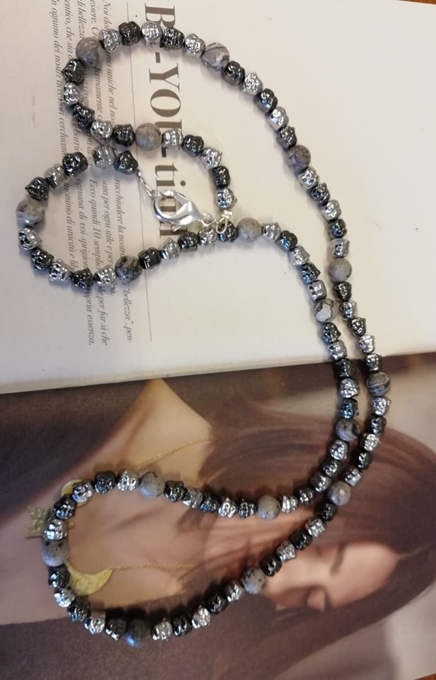 € 16,00 Metti nel carrelloCollana con perle tonde di madreperla, pietre laviche nere, onice, cristalli neri a rondella sfaccettata, distanziatori in ceramica borchiata nera e argento, catena dorata.