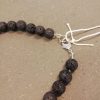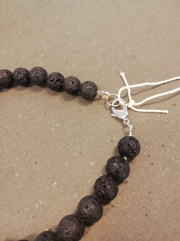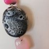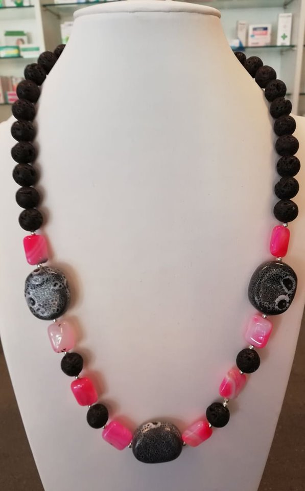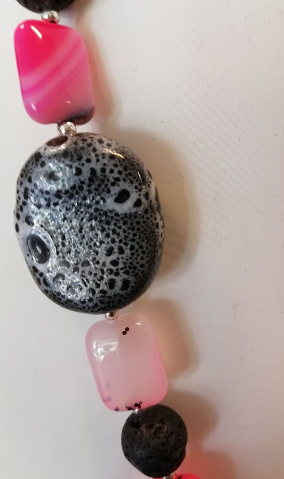 Collana con pietra lavica nera (cm 1), agata rosa rettangolare (1,50 x 1 cm), perle di ceramica grigia (2,3 x 2,5). Lunghezza: cm 60.