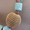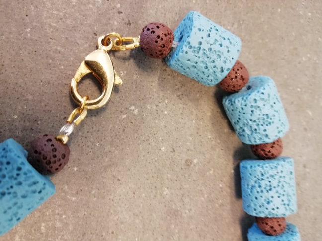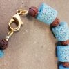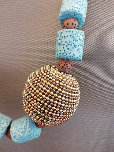 Collana con perle cubiche in pietra lavica blu chiaro (1,50 x 1,50), perle tonde in pietra lavica marrone (cm 0,80), perle in ceramica tonde (cm 4), chiusura a moschettone gold plated. Lunghezza cm 37.