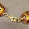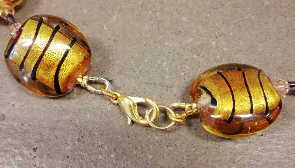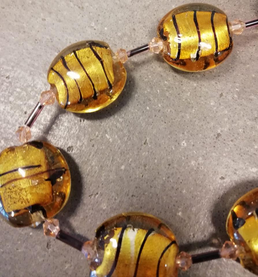 Collana con perle tonde ocra striate nere in pasta di vetro (19 x 19 ), cristalli bicono color pesca (4 mm), baguettes in vetro (6 mm). Lunghezza 34 cm. Chiusura Golden plated.