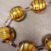 Collana con perle tonde ocra striate nere in pasta di vetro, cristalli bicono color pesca, baguettes in vetro. Chiusura Golden plated.
