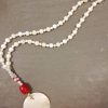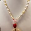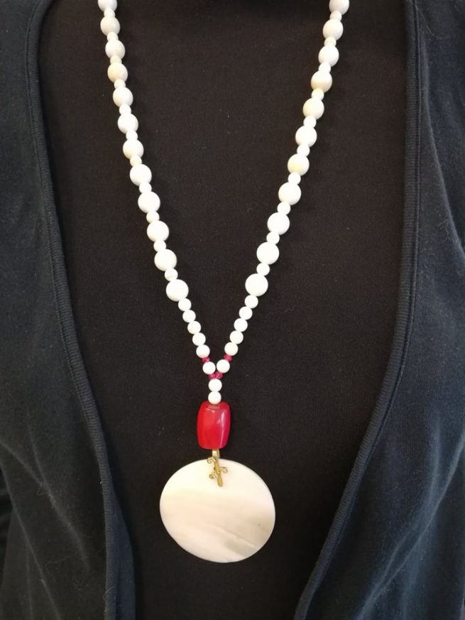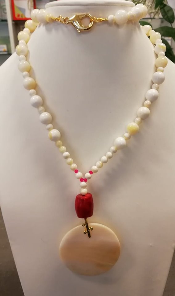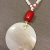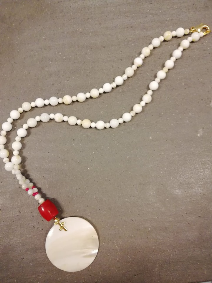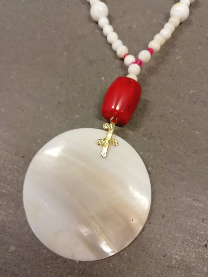 Collana con perle Tridacna (10 x 10 mm) (5 x 5 mm), ciondolo rotondo di madreperla bianca (cm 5,50), corallo rosso in cubetto (1 cm x 2 cm), coralli (3 mm). Chiusura a moschettone gold plated. Lunghezza 73 cm. Lunghezza ciondolo 10 cm.