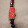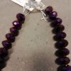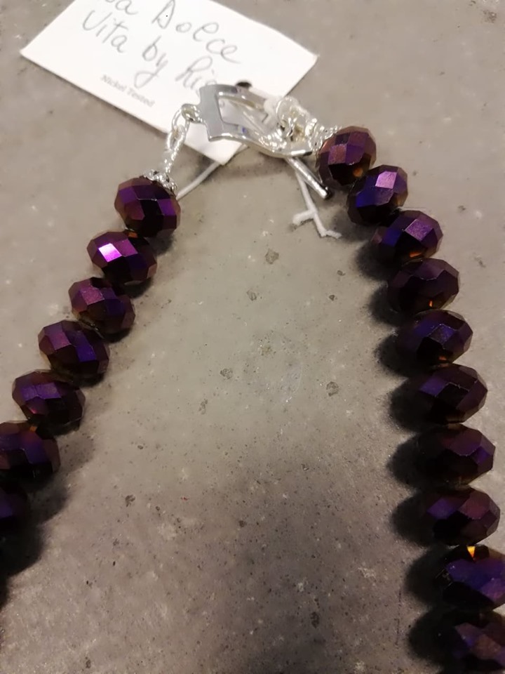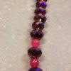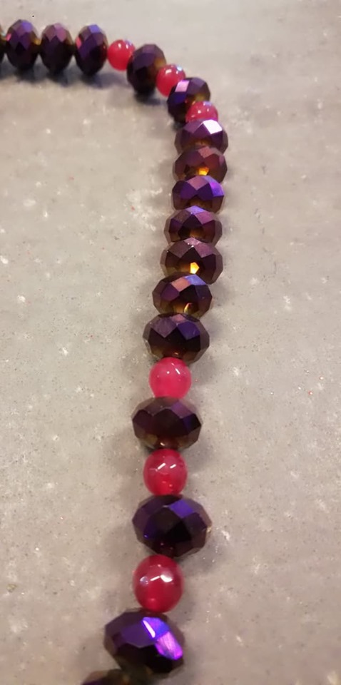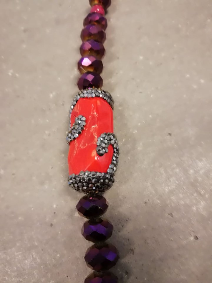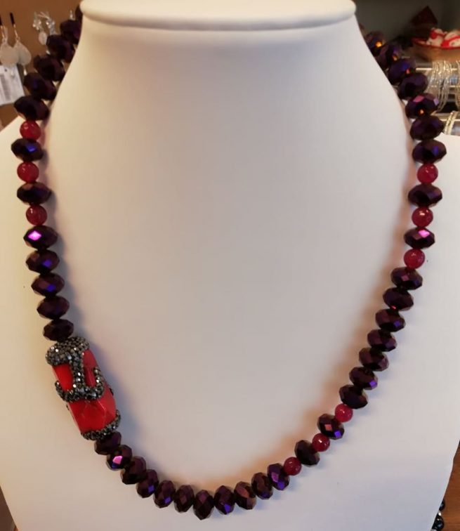 Elegante girocollo con cristalli tondi sfaccettati rosso violaceo (8 mm), perle tonde di giada rosso scuro (5 mm), distanziatore con coralli e brillantini grigi (cm 3 x 1,50). Chiusura T-bar in silver plated. Lunghezza 48 cm.