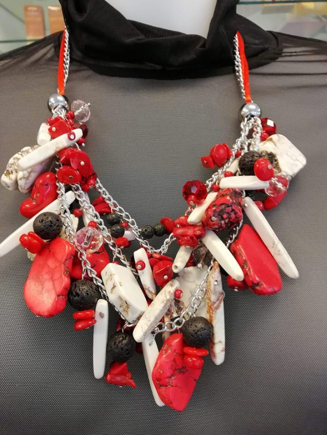 Girocollo a tre fili con pietre di varie dimensioni in howlite rossa, howlite bianca, coralli, pietra lavica, cristalli. Catena argentata e cordino rosso.