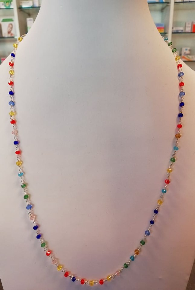 Girocollo rosario con piccoli cristalli multicolor.