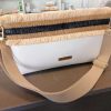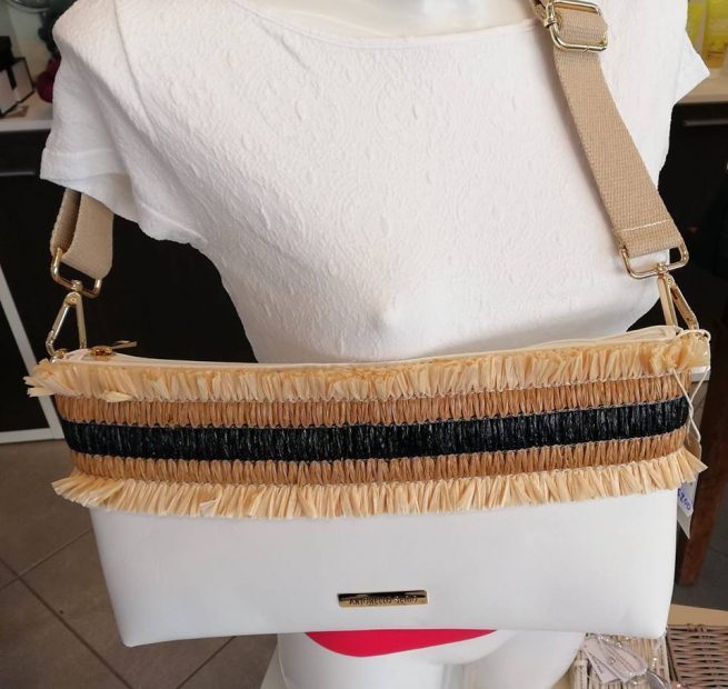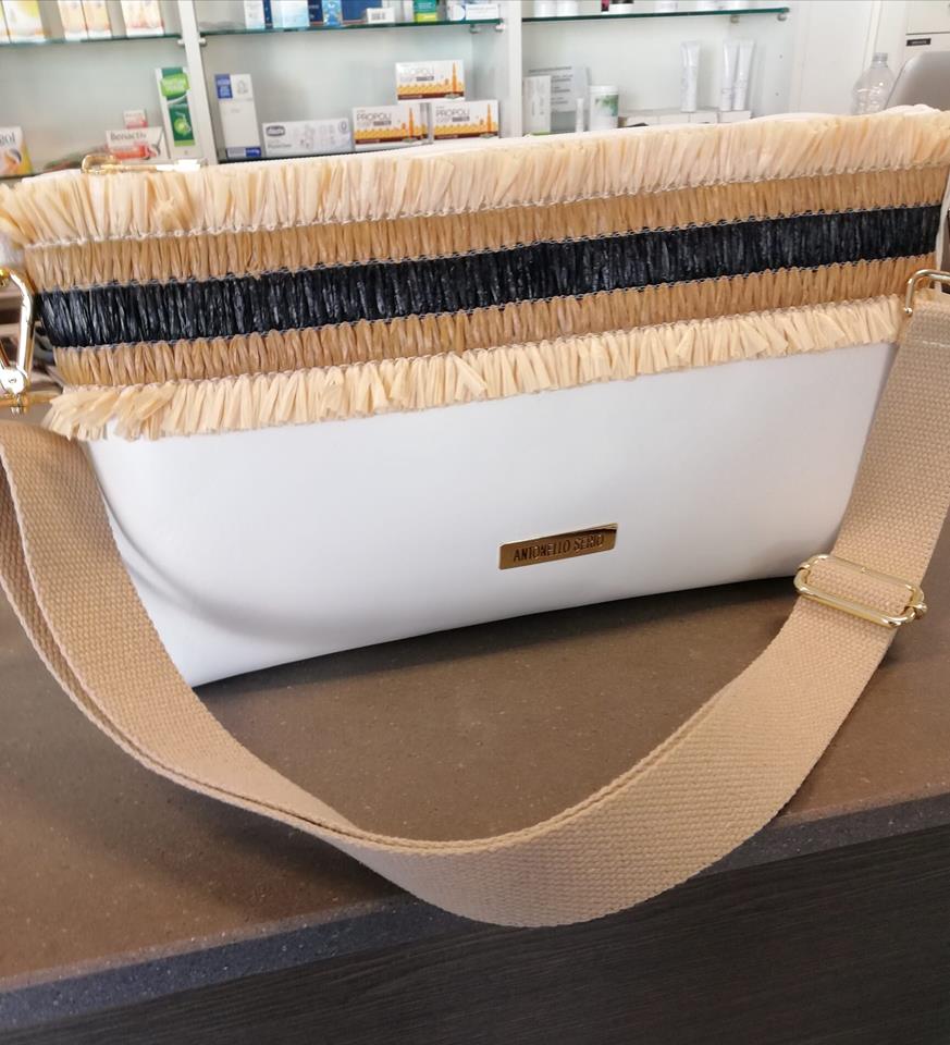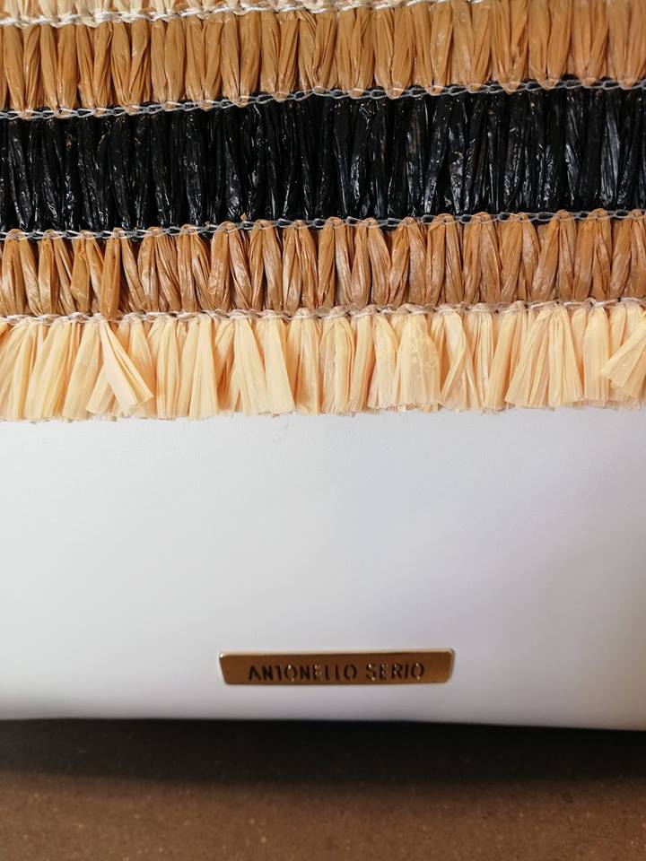 Maxi Pochette bianca rifinita nella parte superiore con paglia nelle varie tonalità beige. Con tracolla écru.