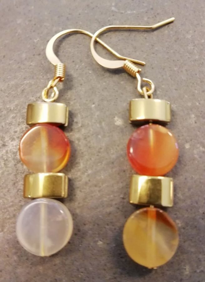 Orecchini con perle di corniola (6 mm), ematite color oro (7 x 4 mm circa), chiusura gold plated.