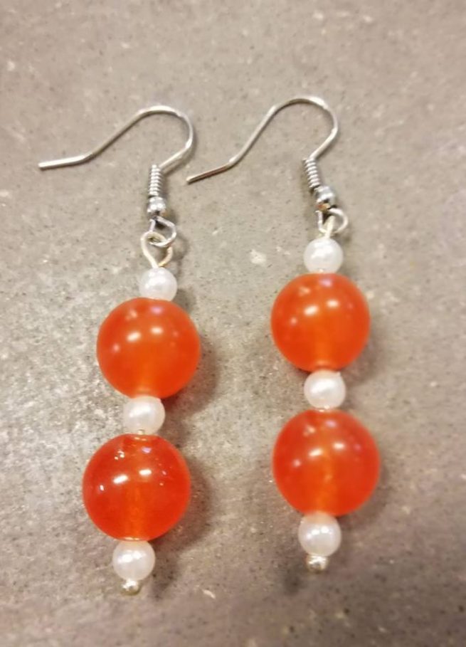 Orecchini con perle di Giada arancione e perline bianche. Lunghezza cm 5.