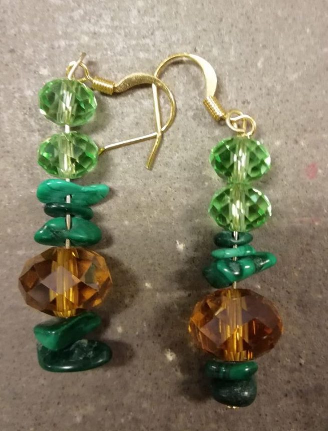 Orecchini con cristalli tondi sfaccettati verdi e ocra, malachite in chips. Monachelle Golden plated. Lunghezza 6 cm.