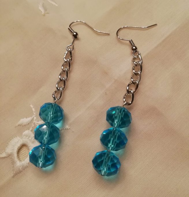 Orecchini con Cristalli sfaccettati Azzurro Ghiaccio e catena argentata. Lunghezza: cm 6,50.