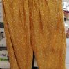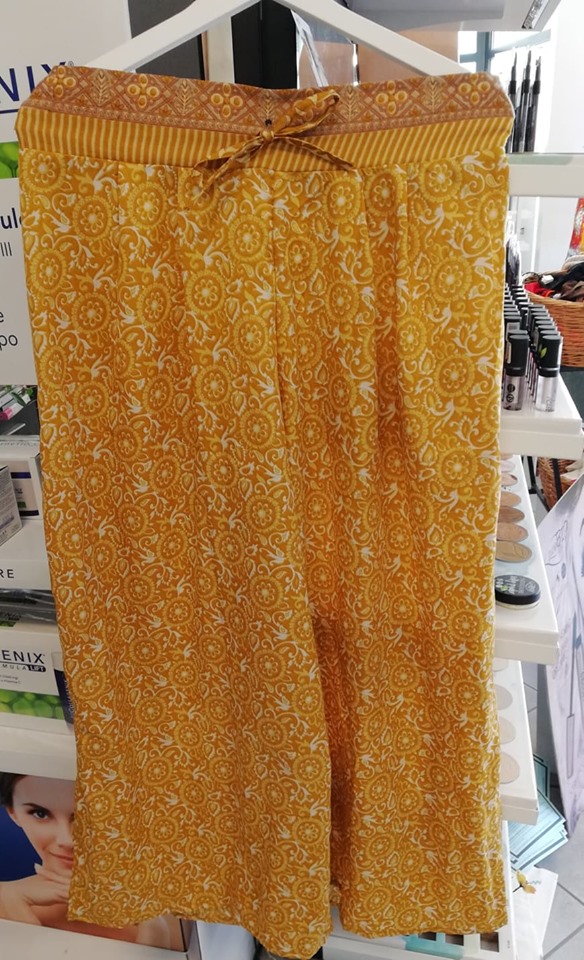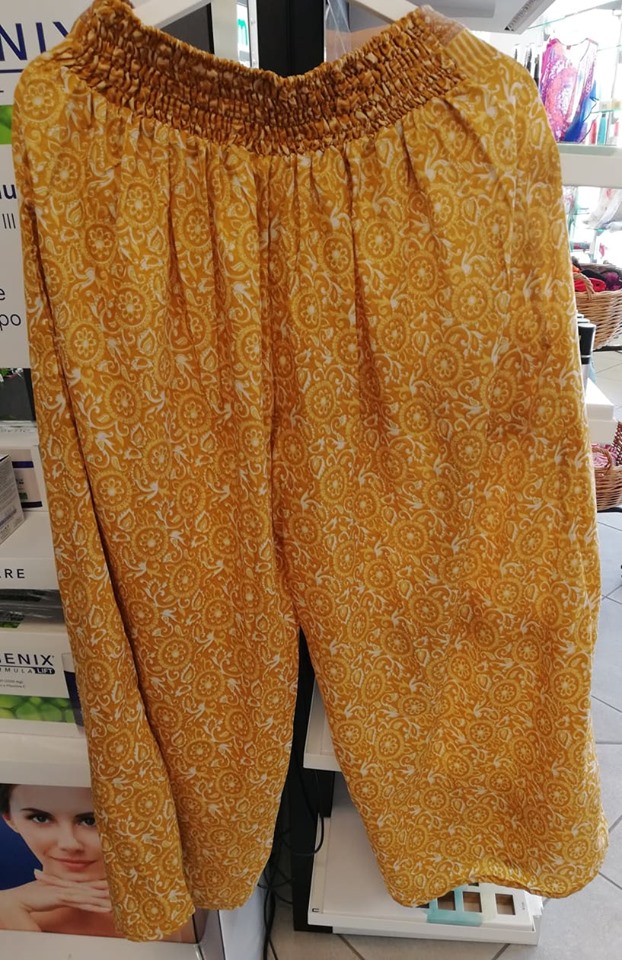 Pantaloni ampi in seta indiana giallo fantasia con arricciatura sul dorso. Larghezza sul fondo cm 40. Lunghezza cm 97.