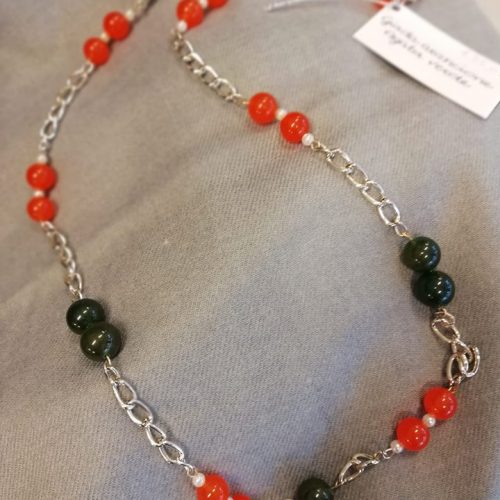 Collana con perle di Giada arancione, Agata verde, perline bianche e catena argentata.