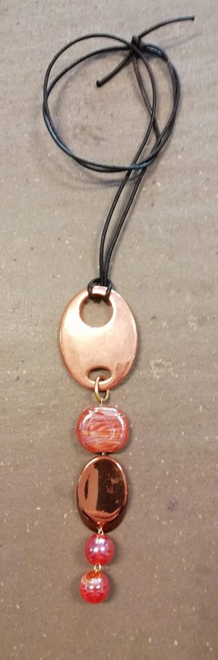 Collana con ciondolo lungo cm 17 composto da elementi ramati, perle in pasta di vetro rosso rame striato. Cordino cerato nero.