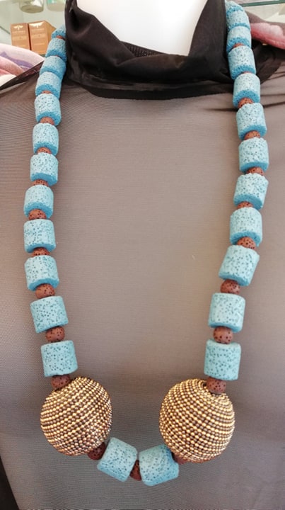 Collana con perle cubiche in pietra lavica blu chiaro (1,50 x 1,50), perle tonde in pietra lavica marrone (cm 0,80), perle in ceramica tonde (cm 4), chiusura a moschettone gold plated. Lunghezza cm 37.