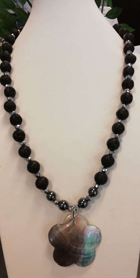 Collana con pietra lavica nera (10 mm), ematite nera (8 mm), cristalli argento a rondella (6 mm), ciondolo in madreperla grigia sfumata effetto cangiante a forma di fiore (cm 5 x 5), chiusura a calamita rotonda con strass (10 mm). Lunghezza cm 65 cm.