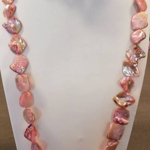 Collana con perle di madreperla rosa a forma romboidale irregolare (2 cm circa). Lunghezza: 60 cm.