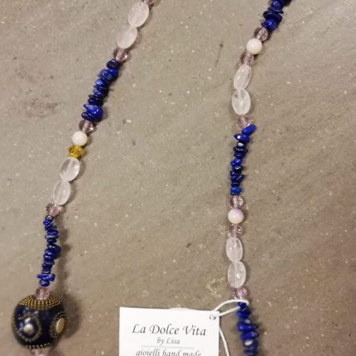 Collana con lapislazzuli blu in chips, quarzo rosa ovale sfaccettato grado A; giada bianca e lilla; cristalli e perle in ceramica argilla borchiate blu. Chiusura in argento 925 con perlina.