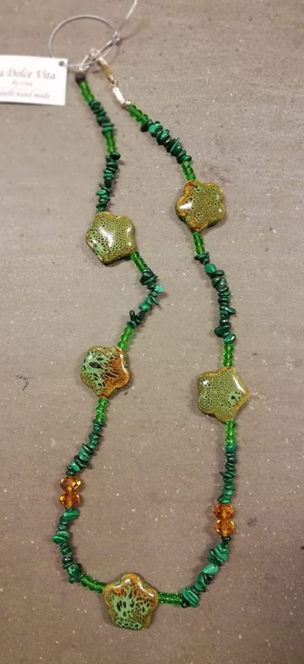 Collana con cristalli verdi rotondi, cristalli tondi color ocra, perle di porcellana a forma di fiore verde con sfumature ocra, malachite in chips, chiusura moschettone silver plated.