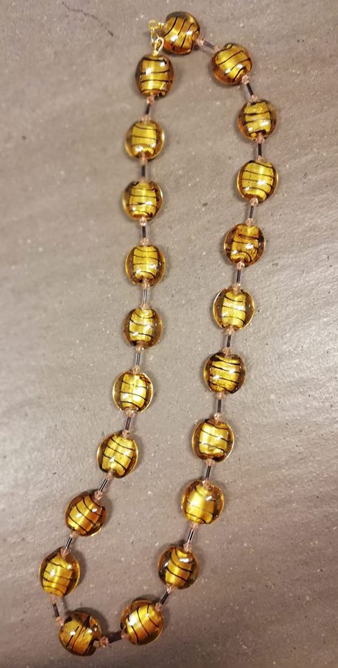 Collana con perle tonde ocra striate nere in pasta di vetro, cristalli bicono color pesca, baguettes in vetro. Chiusura Golden plated.