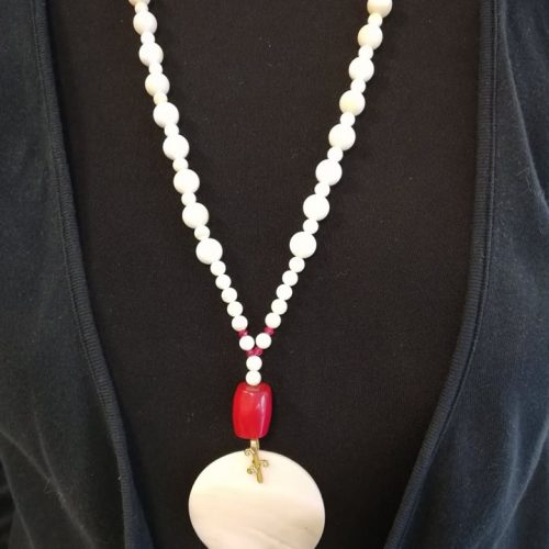 Collana con perle Tridacna (10 x 10 mm) (5 x 5 mm), ciondolo rotondo di madreperla bianca (cm 5,50), corallo rosso in cubetto (1 cm x 2 cm), coralli (3 mm). Chiusura a moschettone gold plated. Lunghezza 73 cm. Lunghezza ciondolo 10 cm.