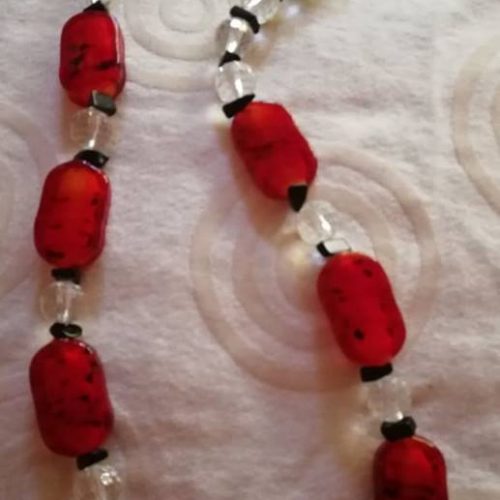 Girocollo con cristalli bianchi, tondi, sfaccettati di 10 mm; pietre di luna nere in chips, perle ovali rosse con sfumature nere in pasta di vetro (17 x 27 mm).