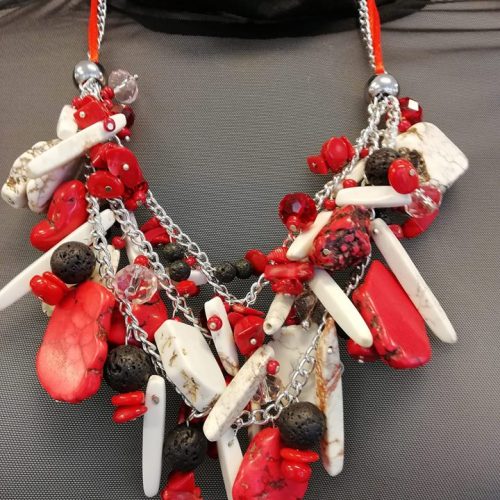 Girocollo multifili con pietre di varie dimensioni in howlite rossa, howlite bianca, coralli, pietra lavica, cristalli.
