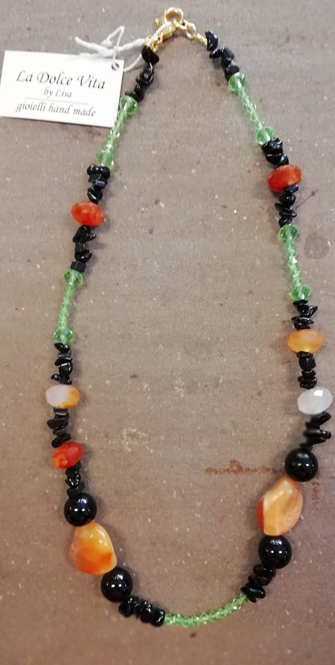 Girocollo con Pietra di luna in chips, Corniola ovale sfaccettata, Corniola pietra irregolare, Onice tondo liscio, Cristalli rondella sfaccettata verde chiaro, Cristalli bicono verde chiaro. Chiusura a moschettone Golden plated.