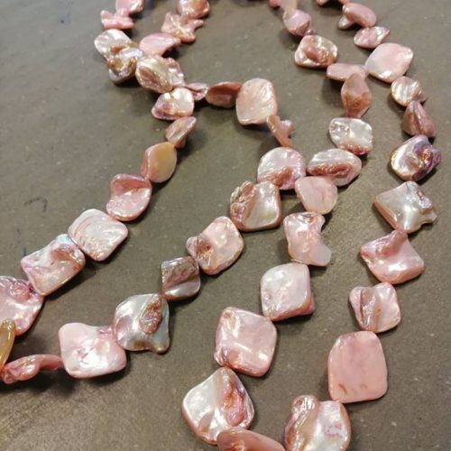 Collana con pietre irregolari di madreperla rosa a forma di rombo. Lunghezza 1,2 mt.
