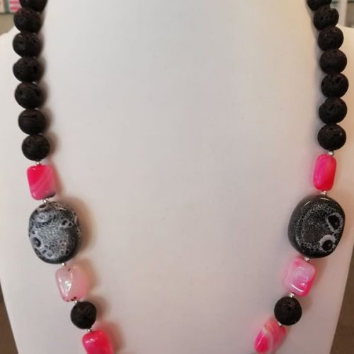 Collana con pietra lavica nera (cm 1), agata rosa rettangolare (1,50 x 1 cm), perle di ceramica grigia (2,3 x 2,5). Lunghezza: cm 60.