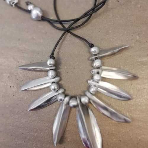 Collana girocollo con chiusura regolabile ed elementi irregolari a forma di foglie bombate, realizzata in 100% alluminio riciclato.
